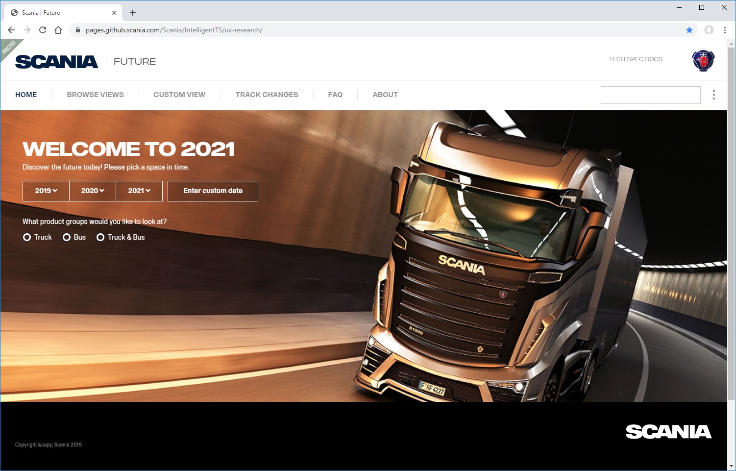 Created in 2018, the goal of the prototype was to allow users to look as far as four years into the future, taking into account all innovations from hundreds of engineering teams at Scania.